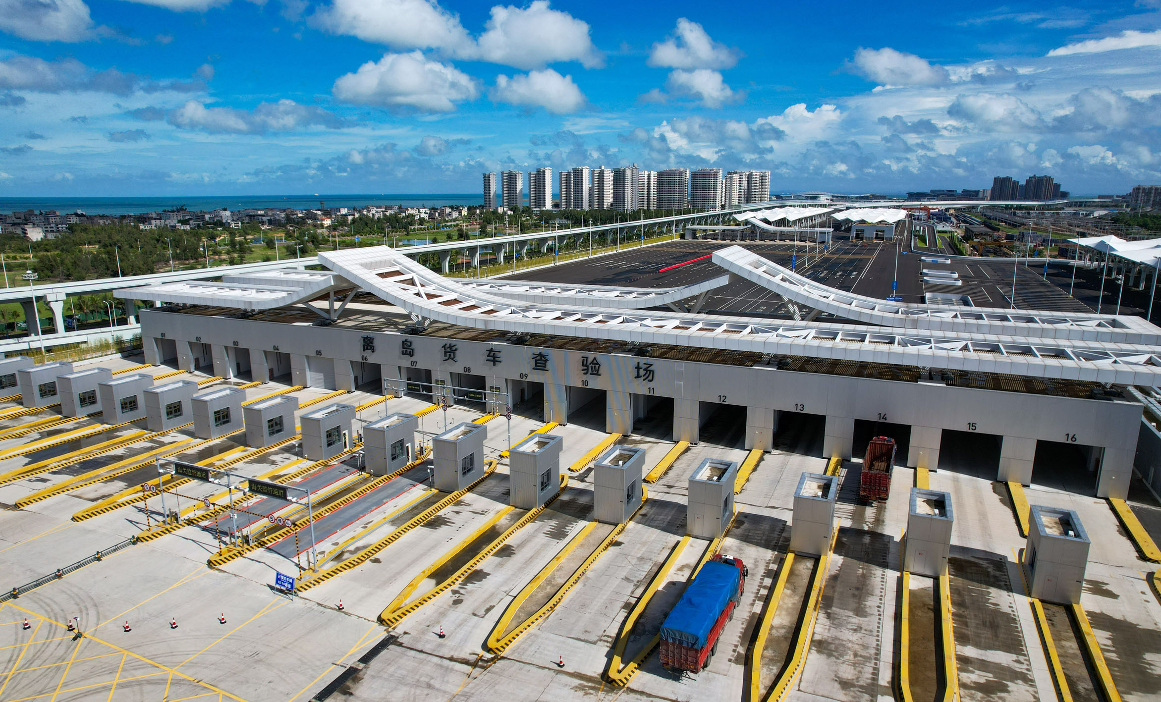 9月17日,离岛货车通过已正式试运行的海口新海港和南港“二线口岸”(货运)集中查验场,开往港区(无人机照片)。根据海南自由贸易港封关运作相关工作安排,自9月15日起,该集中查验场作为新海港和南港货车的统一出岛通道。新华社记者 杨冠宇 摄